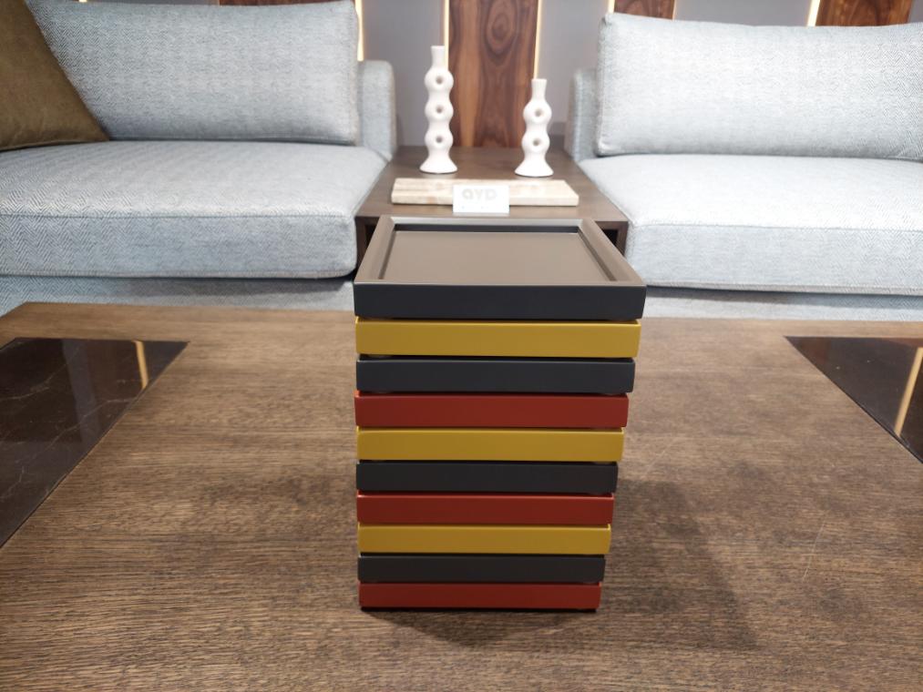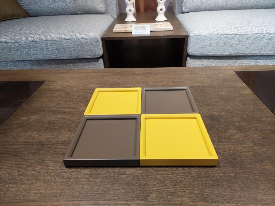 Dörtlü sunum tabağı iki adet antırasit iki adet sarı sunum tabağından oluşmaktadır çay kahve sunumu kuruyemiş lokum kurabiye ve benzeri sunum yaparken farklı bir bakış açısı ve tarz oluşturur Ayrıca sehpanızın ve masanızın üstünde alışılmışların dışında obje olarak farklı olacaktır farklı renkler üretilmektedir Not kuruyemiş kurabiye lokum ve benzeri sunum yaparken peçete kulanmanız tavsiye edilmektedir.